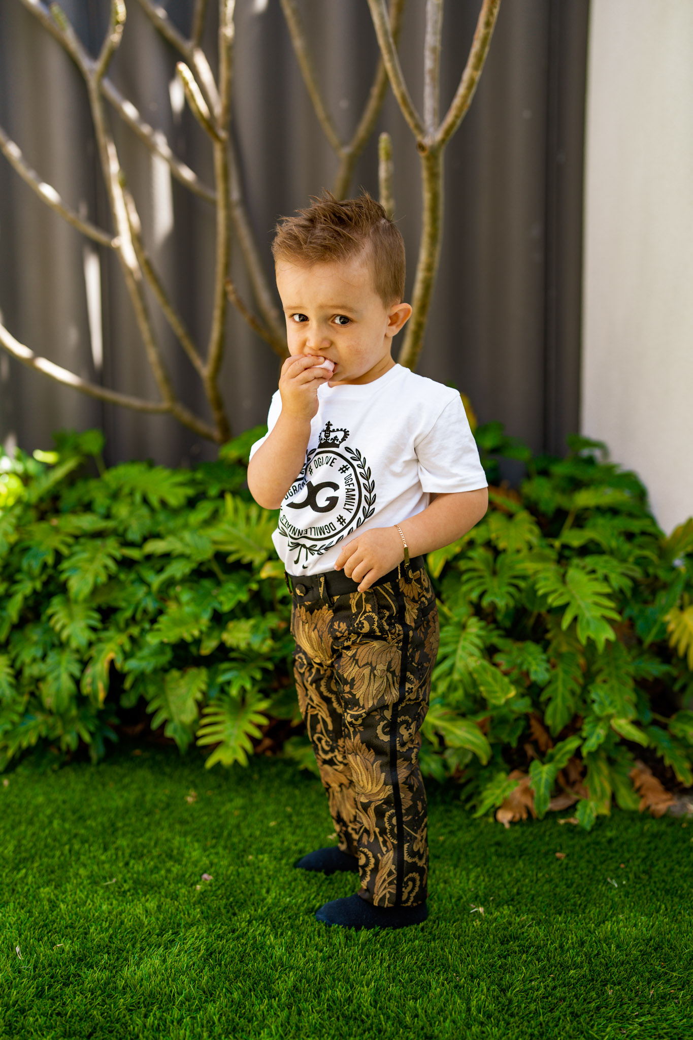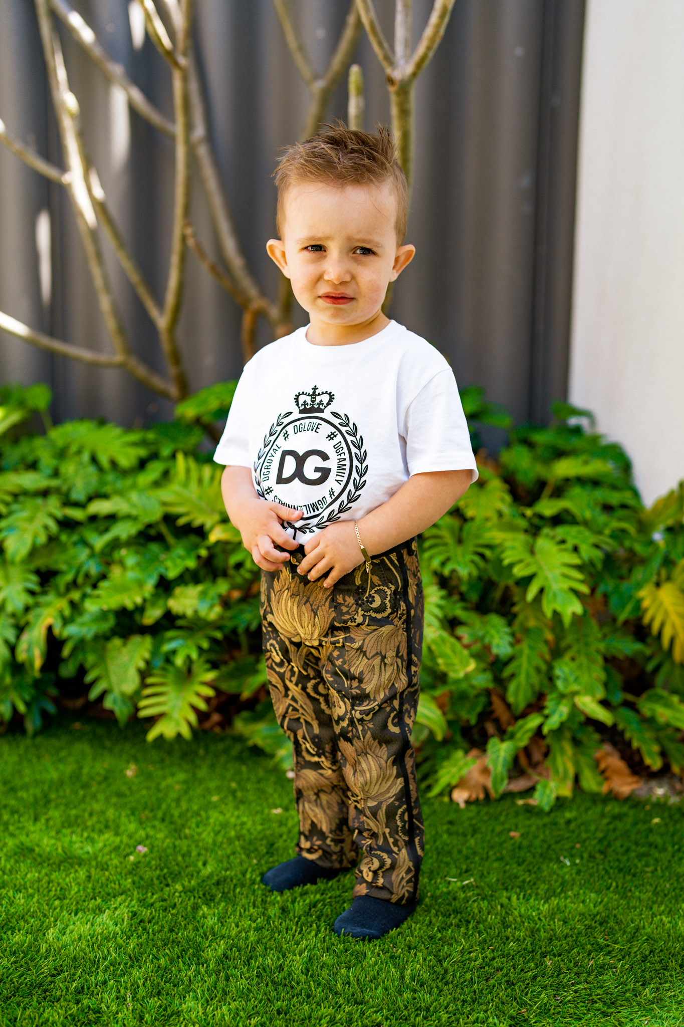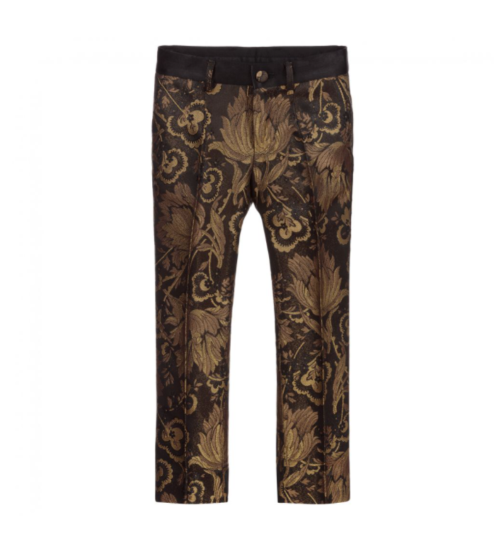 Stylish black and gold brocade trousers from the mini-me Dolce and Gabbana Kids. Dress them up with a long sleeve shirt, or play it cool with the D&G T-shirt, these incredibly soft and comfortable trousers are fully lined is silky viscose with black silk trims on the outer seams. They also have an adjustable waistband.