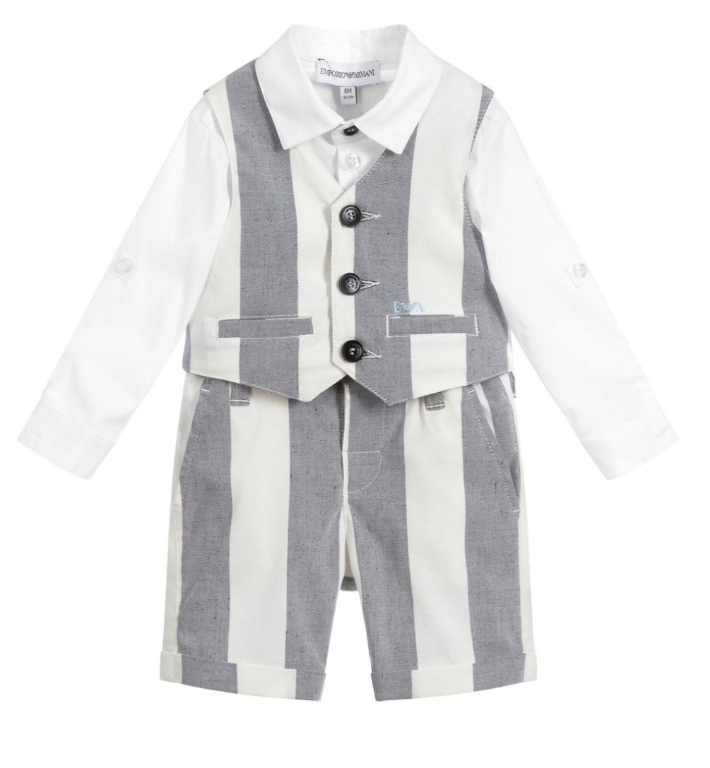 A beautifully tailored 3 piece suit set by Emporio Armani. A stunning striped white, ivory and navy blue linen/viscose blend with the Eagle logo on both the white shirt and waist coat. All 3 pieces are button fastening, and the shorts have a button adjustable waist band. The white shirt can be worn as long sleeve, or rolled up and buttoned as a short sleeve. A very soft and comfortable set.