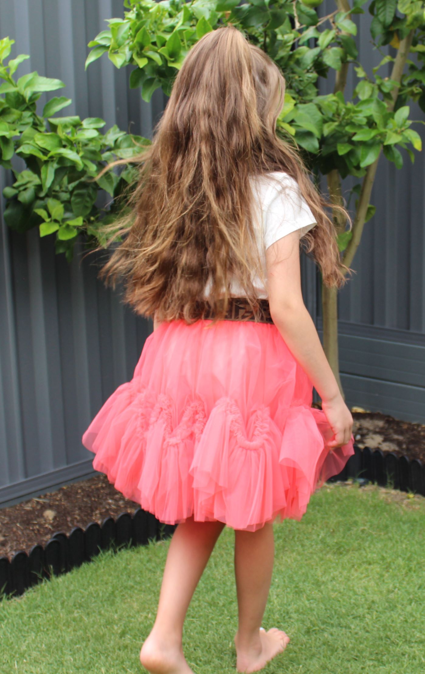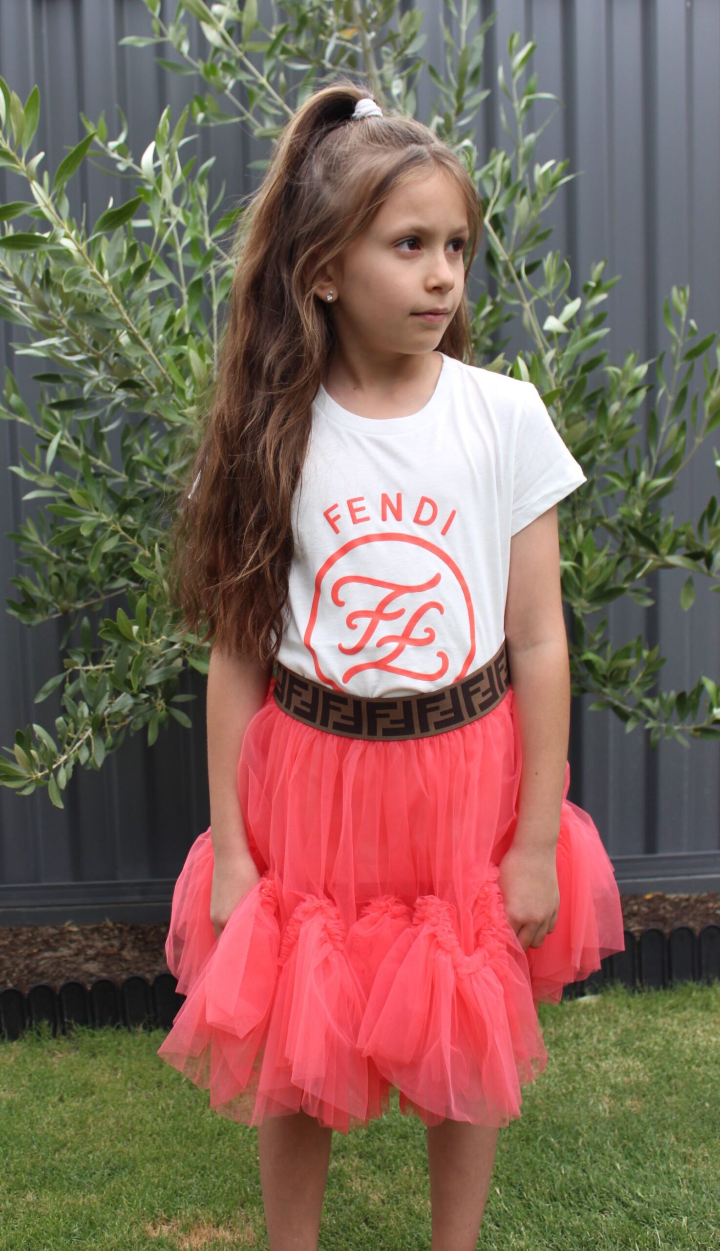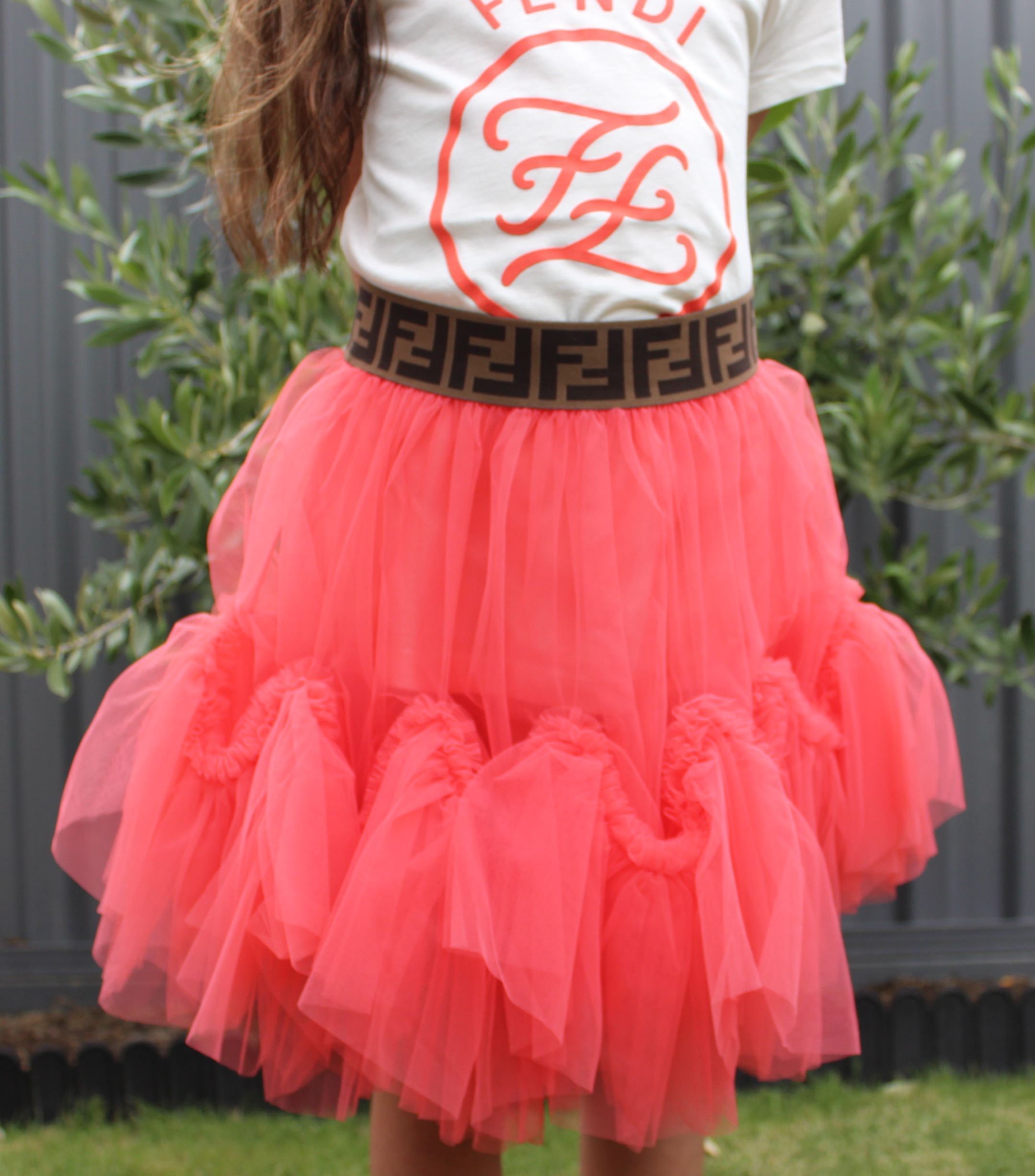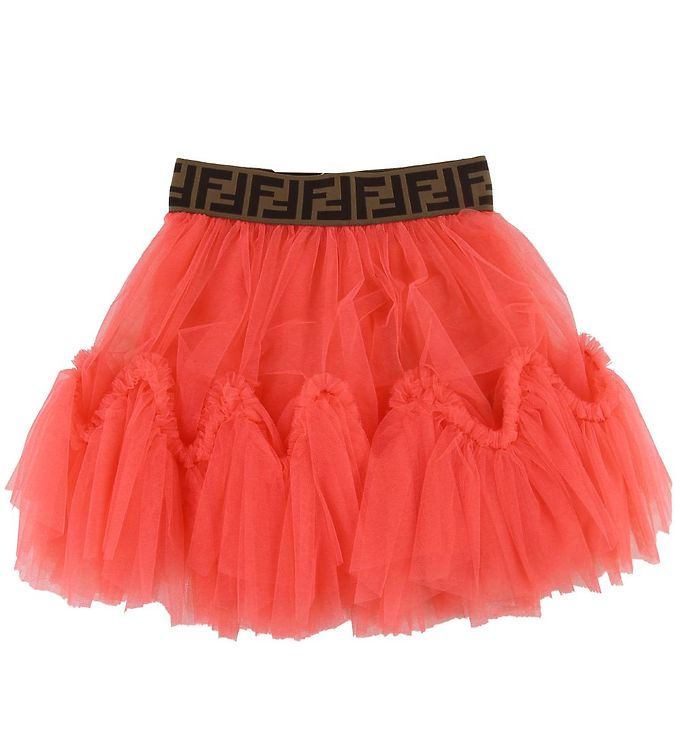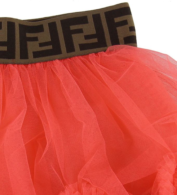 Stunning Fendi tulle skirt in a bright coral red colour. Featuring the classic FF logo on the waist band in dark brown. The Fendi skirt has a wide elastic at the waist and underneath consists of 4 layers of tulle. The outer layer has extra width and a wide ruffle edge.
